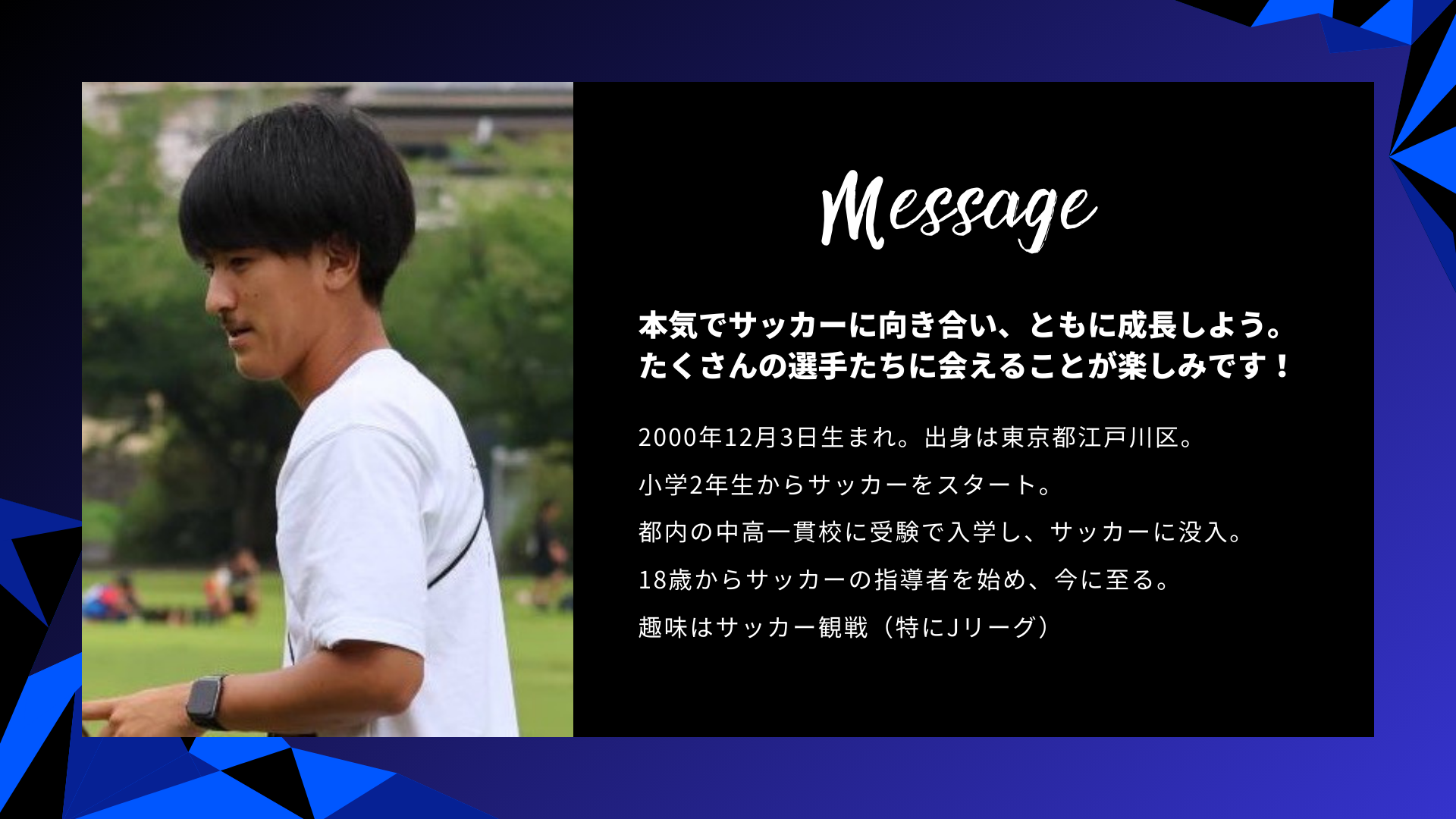 私は18歳の頃からサッカーの指導者として歩み始め、園児 / 小学生 / 中学生と、成長段階の異なる多くの選手たちと向き合ってきました。